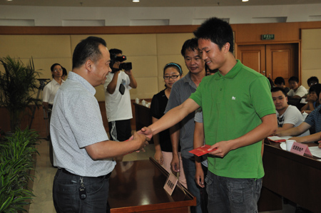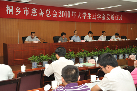 827日下午,桐鄉市慈善總會2010年大學新生助學金發放儀式在市政府舉行,雙箭股份也響應號召積極捐款助學。圖為董事長沈耿亮代表雙箭股份公司出席了助學金發放儀式。